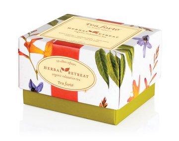 An invitation to retreat, relax and rejuvenateRetreat to a place where restorative calm and peace are found. A rejuvenating naturally caffeine-free herbal infusion to relax the mind and soothe the spirit. The perfect way to introduce the wonderful world of Tea Forte.Tea Forte Petite Herbal Retreat Ribbon Box Ten Silken Pyramid Infusers Feature