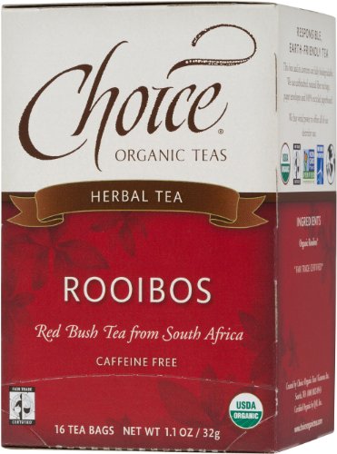 USDA organic. Fair Trade certified. Rooibos, the Red Bush Tea of South Africa, was the development of mountain inhabitants centuries ago. Described by many as having astounding healing powers, the tea brewed from Rooibos is also abundantly flavorful, Caffeine-free, yet full-bodied with a sweet, earthy aroma. Choice Organic rooibos invites a thoroughly relaxing tea break. Choice Organic Teas are certified as organically grown by an independent third party. A thorough audit trail follows the tea from the gardens of origin to your cup, and every aspect of the cultivation, handling and packaging is carefully inspected to insure the integrity of this organic product. Choice Organic Teas come from mountain top gardens tended by traditional methods. Without chemicals, our Choice tea growers practice careful topsoil management and weed control, creating a balanced environment to alleviate any agricultural problems. With expertise and very diligent care, they achieve exceptional teas. Fair Trade guarantees fair wages for workers, improving their opportunities for better healthcare. By choosing Fair Trade tea, you are directly contributing to the livelihood of tea growing communities. This Fair Trade tea is independently certified by TransFair USA. Certified organic by QAI, Inc.Choice Organic Rooibos, Red Bush Tea, Caffine Free, 16-Count Box (Pack of 6) Feature