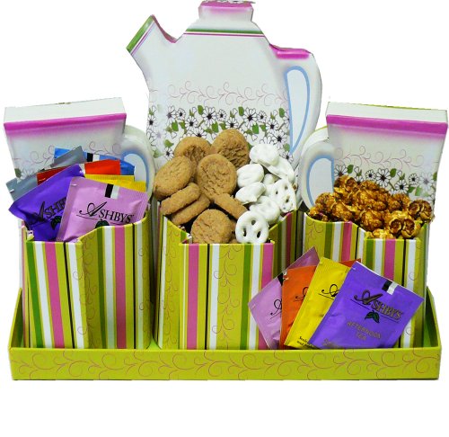 This gift box set is so unique and clever, guaranteed to be the most memorable gift for your tea lover! We start with 3 beautifully detailed gift boxes shaped like a real teapot and set of tea cups. They nestle in their own little tray, filled with a delightful sampling of premium Ashby teas and gourmet treats tucked inside each "cup" and "teapot". Lift the lids off each box to discover an assortment of 20 Ashby teas to sample in Orange, Herbal Lemon, Mint, Earl Grey, English Breakfast, Plum Fantasy and more! For her snacking pleasure, enjoy White Frosted Pretzels, gourmet Chocolate Chip Cookies, and for a unique treat, Bali's Best Green Tea Candy. Once the goodies are gone, the boxes make a great decor addition and handy tea storage containers for any kitchen. Each gift is crafted with attention to detail and includes a personalized gift message from you to convey your best wishes on any gift occasion.An original gift basket arrangement designed by Art of Appreciation Gift Baskets™.