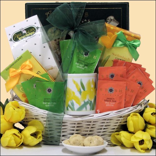 Send Mom this delightful gourmet tea gift basket. It is filled with a wonderful assortment of flavored and herbal teas, as well as delicious gourmet snickerdoodle cookies & sweets. Features a painted Iris designed 11 oz ceramic tea mug.Soul Celebration: Mother's Day Gourmet Tea Gift Basket Feature