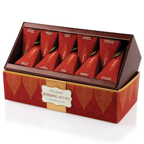 Steaming, aromatic, delicious cups of tea fill heart and home with the warmth of the season. The Warming Joy Tea Collection makes the perfect gift for friends and those you treasure. With a sophisticated red and gold palette, this festive Ribbon Box of limited edition teas contains: Harvest Apple Spice, Winter Chai, Moroccan Orange Blossom, Vienna Cinnamon, Hazelnut Truffle. It's wonderful for any gathering, or to enjoy by yourself in front of the fire.Warming Joy Ribbon Box by Tea Forte 20 Silken Pyramid Infusers Feature