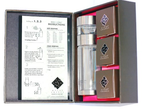 Eight Cranes "Perfect Steeper Gift Set" is a portable tea brewer and 8 ounce glass tea tumbler all in one attractive unit, including 3 teas. The teas included are 12 gm each of Phoenix Oolong Tea (Huang Zhi Xiang), Black Tea (Keeman) and Jasmine Tea (Dragon Pearl Jasmine Supreme). The unit has double-walled chambers with high tempered glass inside and outside with stainless accents. It provides an easy way to brew high quality loose leaf tea without the mess of a traditional teapot and cups. Simply remove the top (steeping chamber) from the cup and add hot water to the cup. Replace the steeping chamber and secure snugly to the cup. Next remove the lid from the steeping chamber and add loose leaf tea. Replace the lid and slowly invert the steeper so the steeping chamber fills with water, and allow the tea to steep for 1-3 minutes. Slowly return to the steeper to its upright position allowing the water to drain back into the cup. Remove the steeping chamber and drink from the cup. This is a great gift item, great for traveling, use at home, office or wherever you go.Eight Cranes PS-GG-3T Perfect Steeper Portable Loose Leaf Tea Brewer and 8-Ounce Glass Tea Tumbler Gift Set Includes 3 Teas Feature