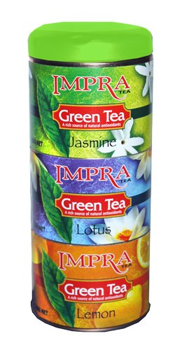 Impra Green Tea Gift Pack is an excellent way to try three of Impra's most popuar green te flavors. Each pack containes a 100 gran tin of Jasmine, Mint & Lemon Green Tea. Rich in natural antioxidants. 100% Pure CeylonImpra Green Tea Gift Pack, 3 -100-Gram Cans (Pack of 3) Feature