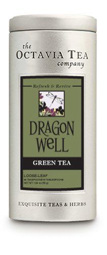 Dragon Well (Long Jing) is the most famous Chinese tea, with broad, flat leaves shaped like the blade of a sword. This voluptuous tea envelops the palate with a lovely orchid-like fragrance, a delicious, roasted chestnut-like flavor and an earthy, lingering finish. Often called the national drink of China, Dragon Well is frequently given to visiting heads of state. This tea is rich in antioxidants and promotes mental alertness. (These statement have not been evaluated by the FDA. This product is not intended to diagnose, treat, cure, or prevent any disease.)Octavia Tea Dragon Well (Green Tea), 1.94-Ounce Tin Feature